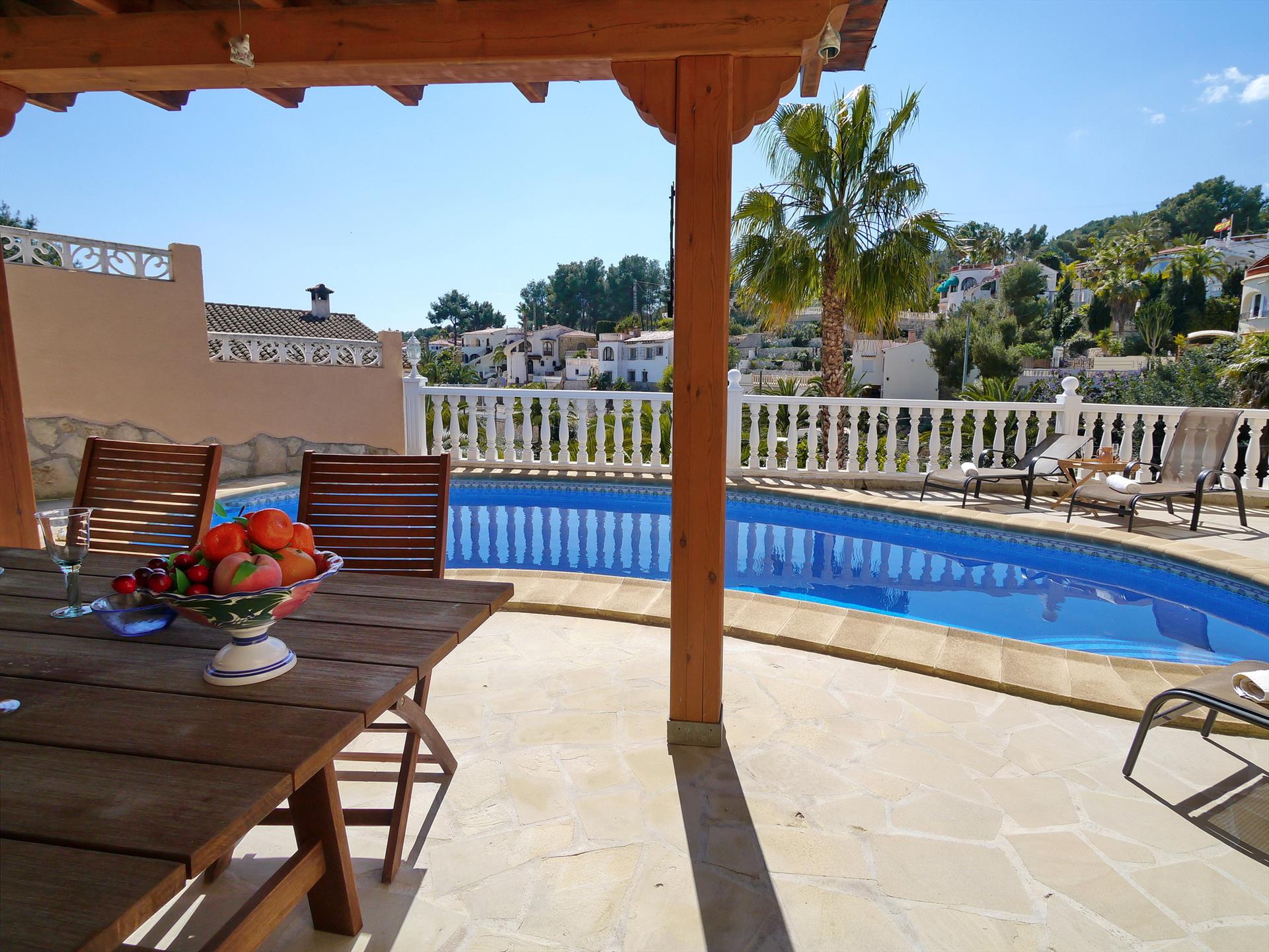Hermosa y romántica villa con piscina privada en Benissa, Costa Blanca, España, para 4 personas. La casa está situada en una zona residencial cerca de la playa, a 2 km de la playa de Cala Advocat y a 5 km de Moraira.