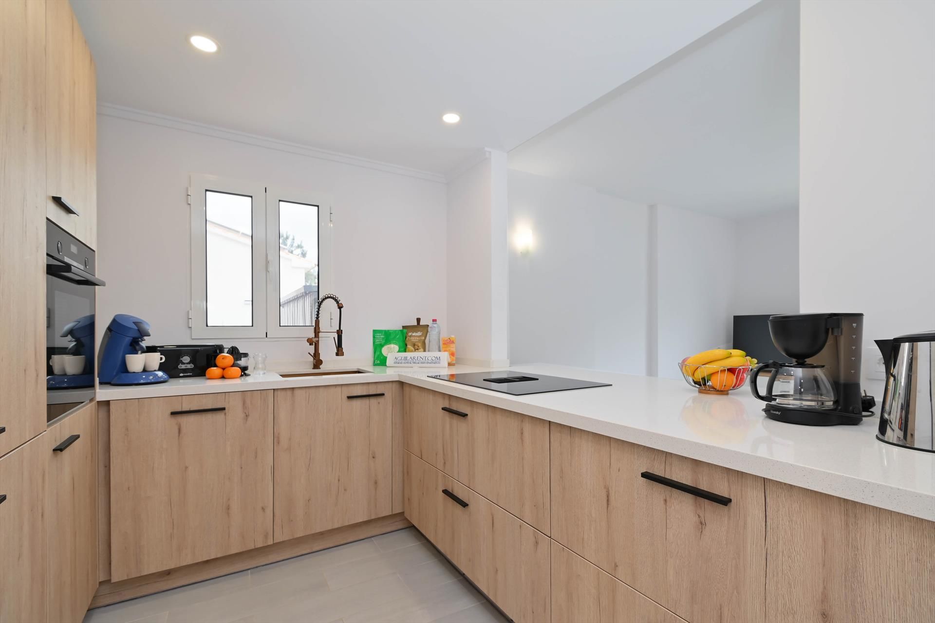 • Cocina abierta con placa eléctrica, horno eléctrico y de microondas, microondas, lavavajillas, frigorífico-congelador, cafetera, hervidor eléctrico, batidora, tostadora y exprimidor