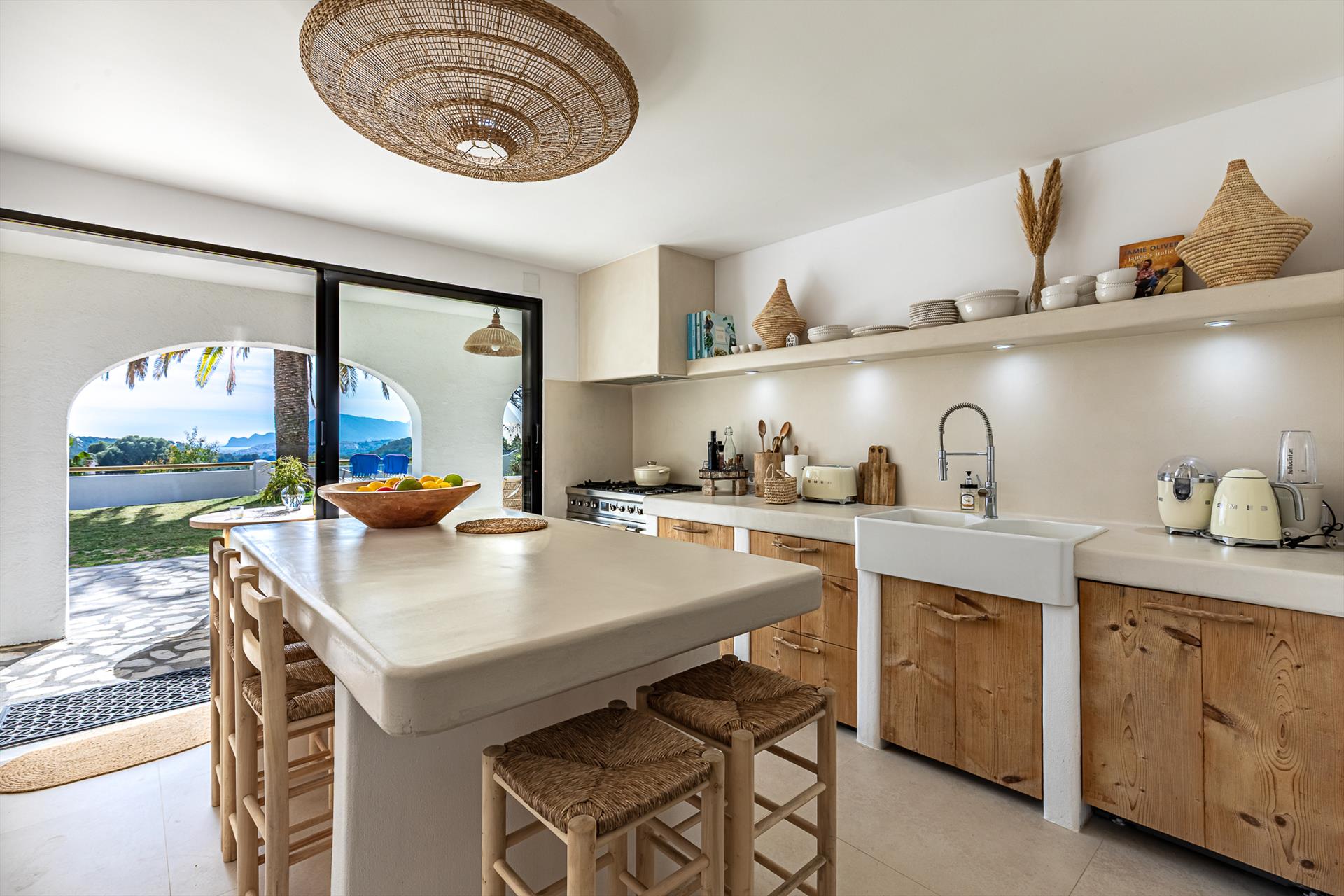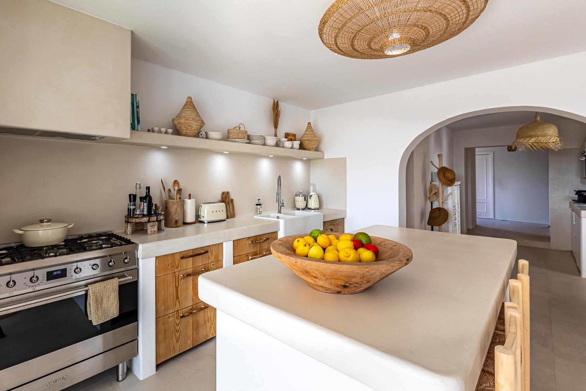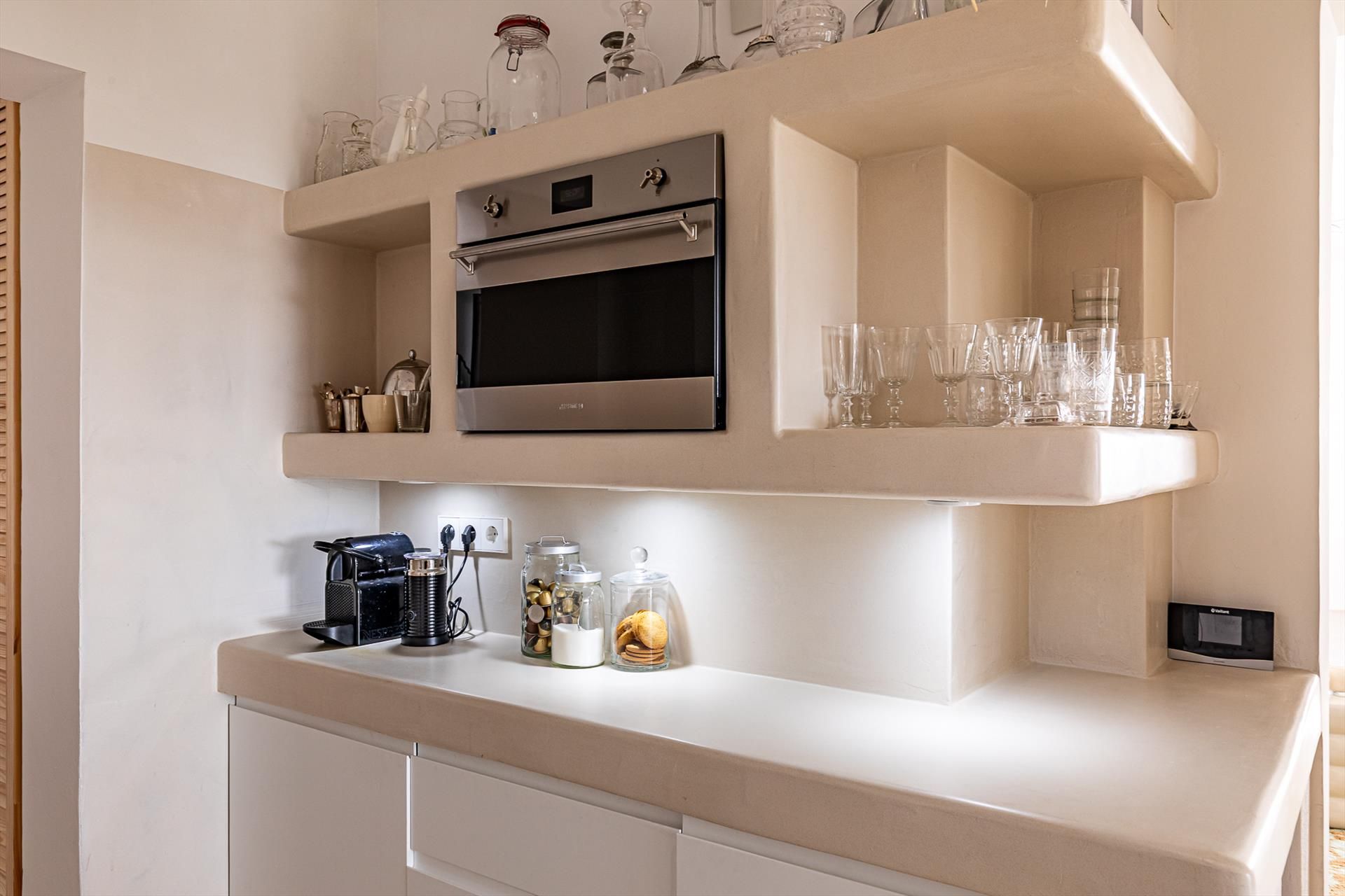 - cucina aperta con piano cottura a gas, forno elettrico, microonde, lavastoviglie, frigorifero-congelatore, macchina da caffè, kettle elettrico, frullatore, tostapane e spremiagrumi