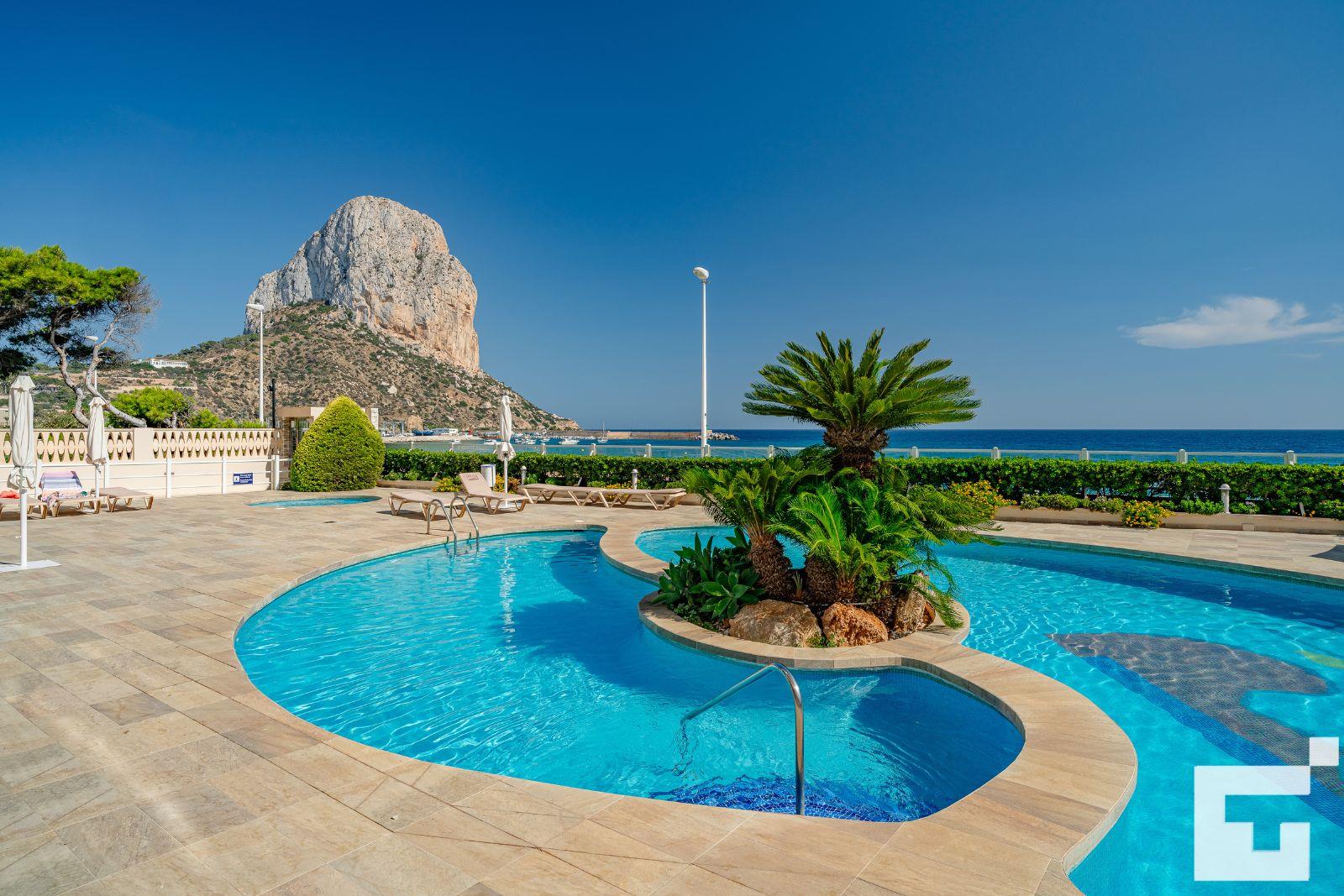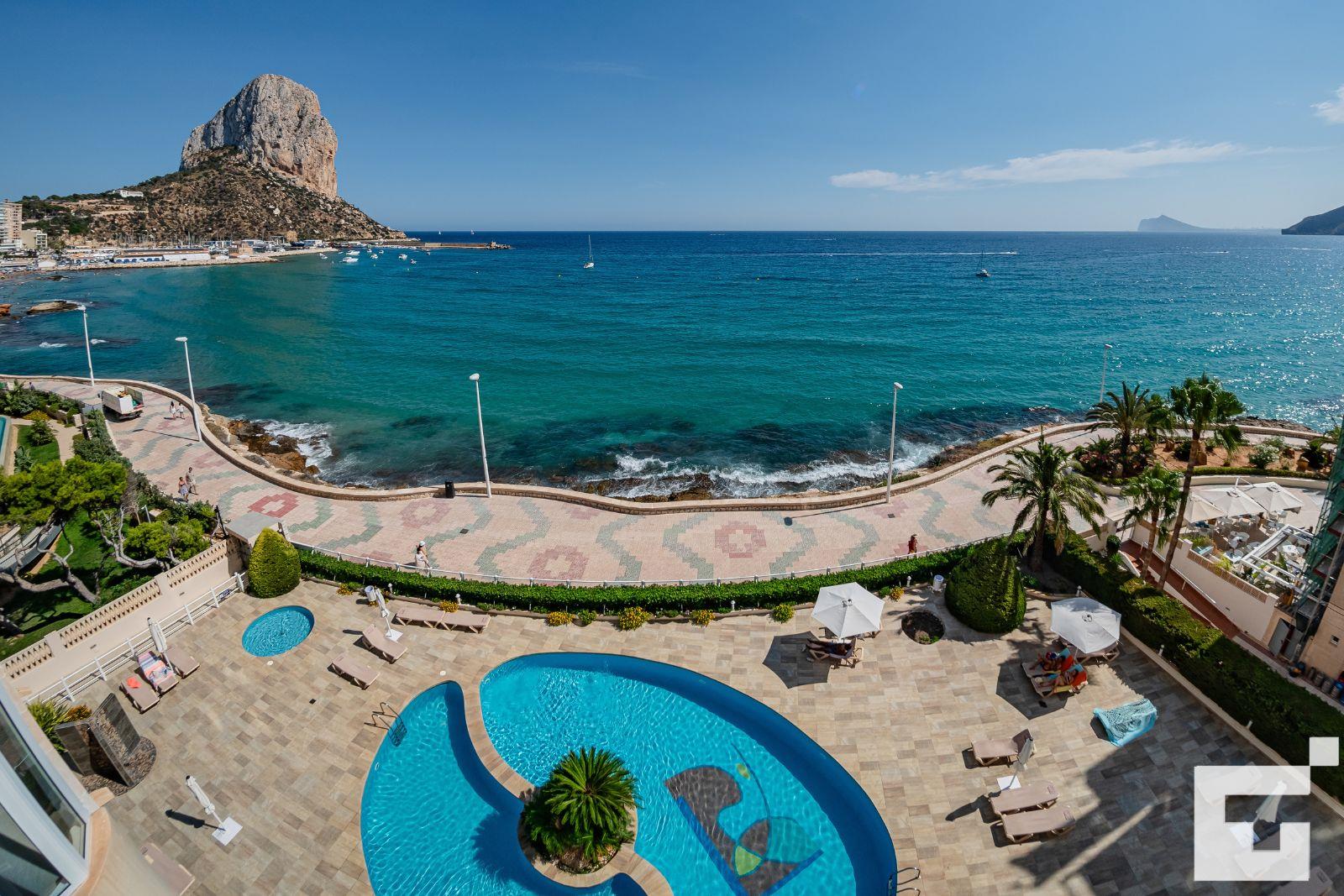 Appartamento con piscina comune a Calpe, Costa Blanca, Spagna, per 7 persone. L'appartamento è situato vicino a ristoranti e bar, negozi, supermercati e un campo da tennis ed è a 25 m dalla spiaggia Playa Cantal Roig.
