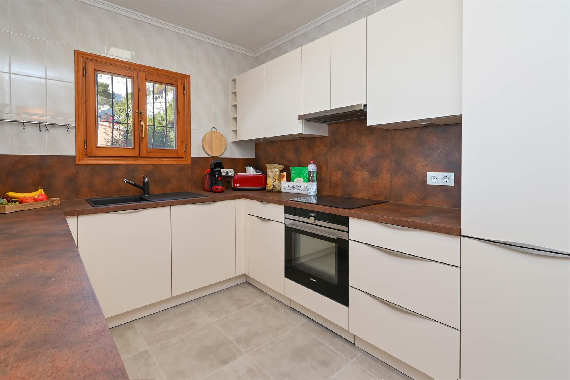 • kitchen with electric hob, electric oven, microwave, refrigerator with freezer, coffee machine, electric kettle, mixer, toaster and juicer