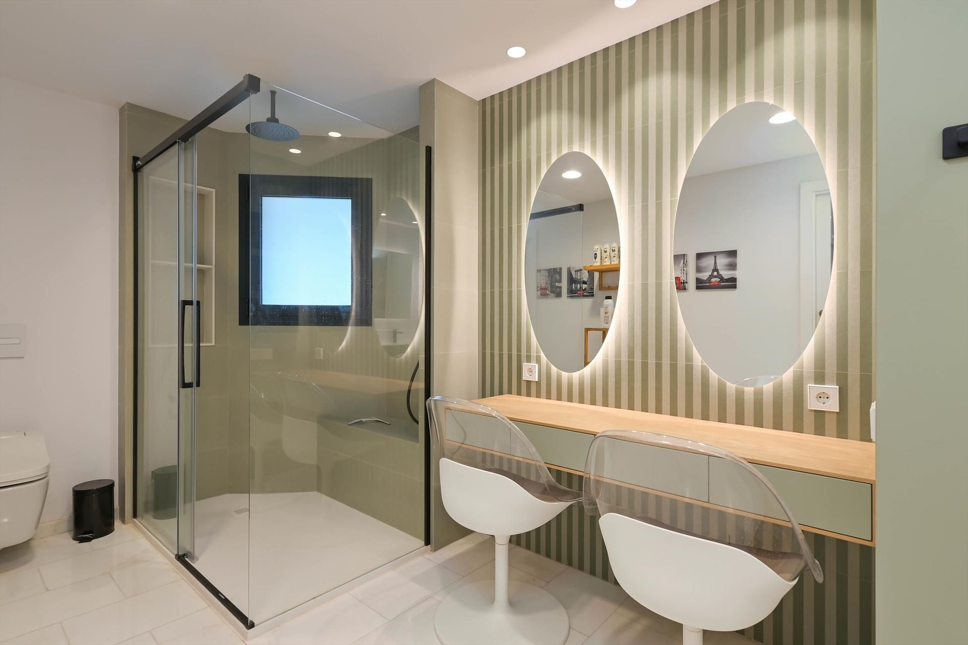 • en-suite bathroom with double washbasin, shower and toilet