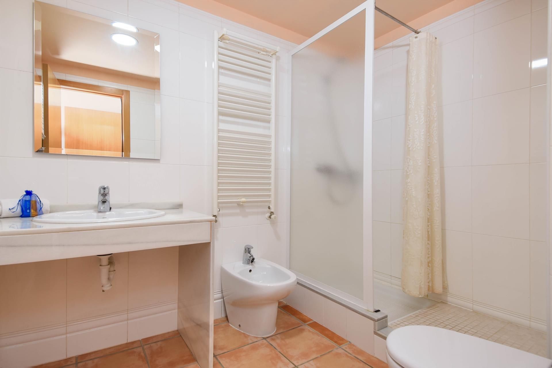 • en-suite bathroom with single washbasin, shower, bidet and toilet