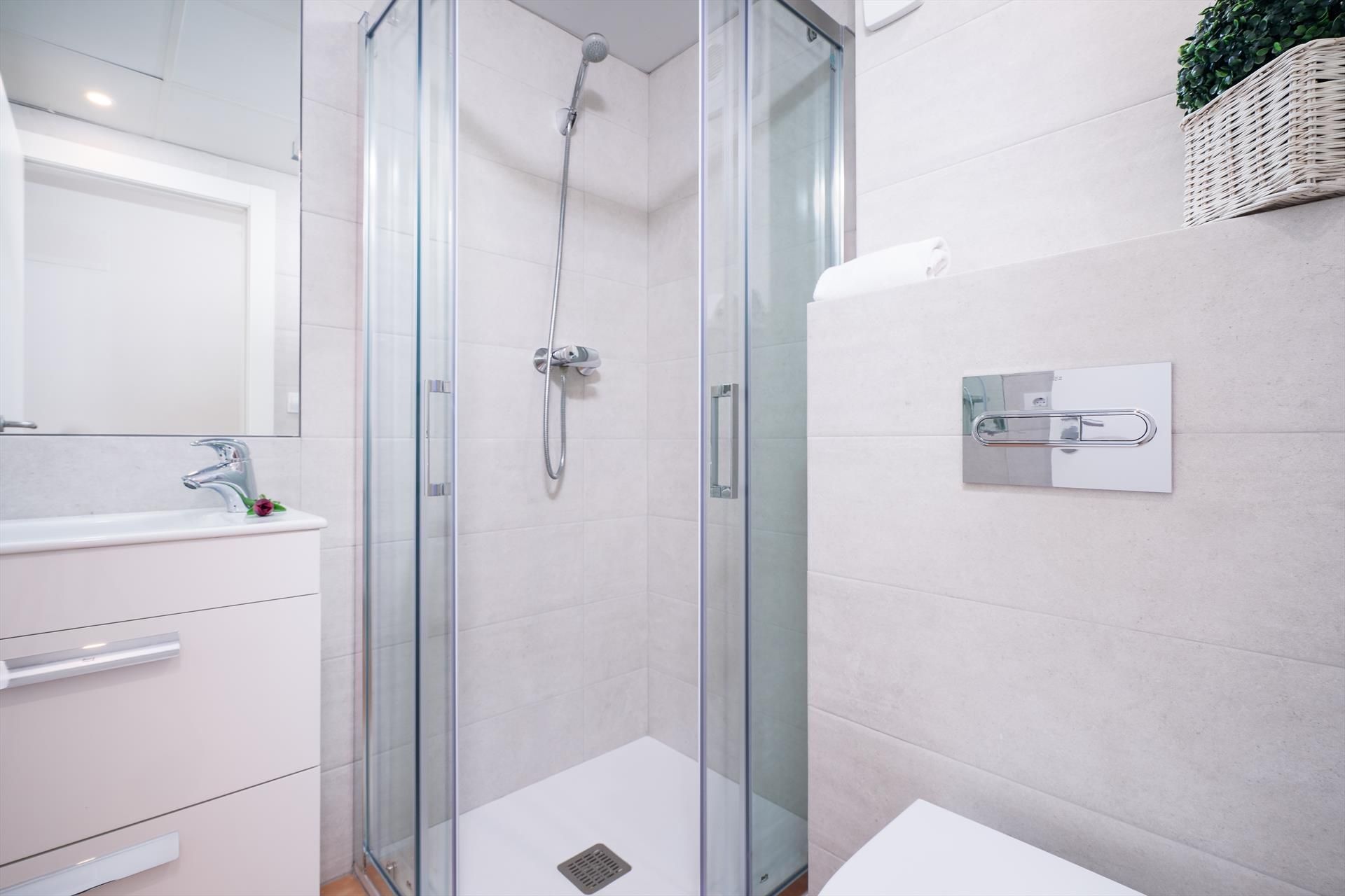 • bathroom with single washbasin, shower and toilet