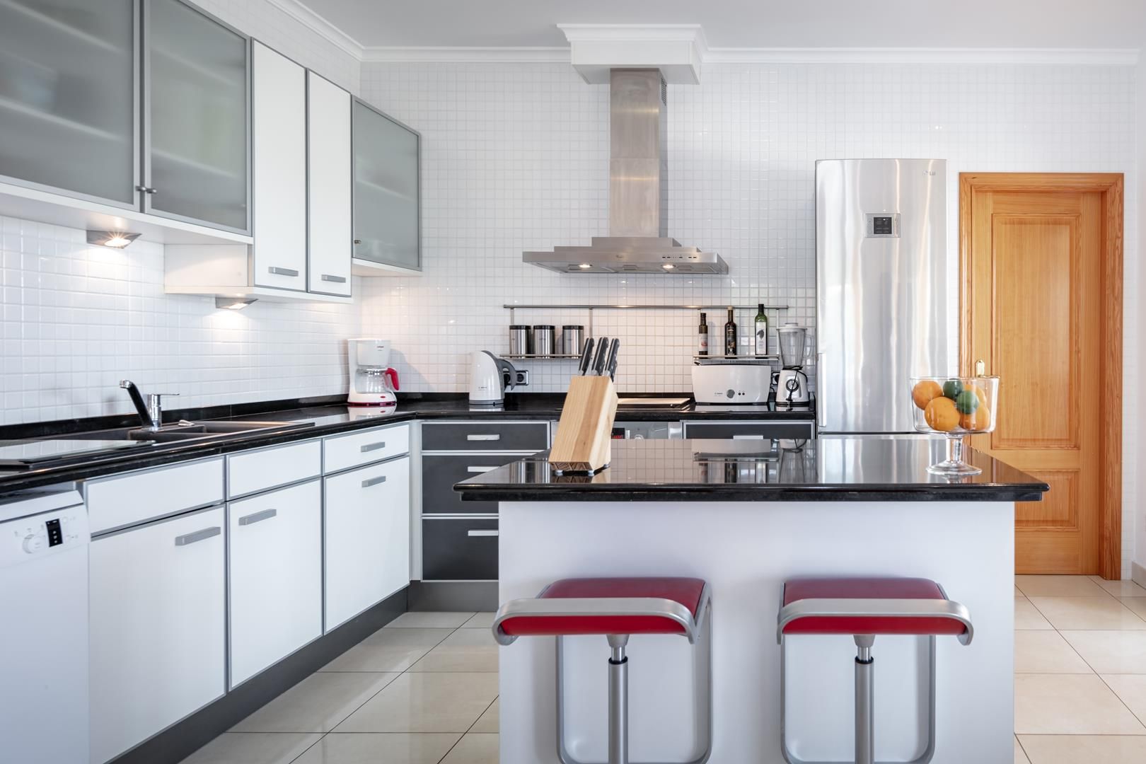 • Open kitchen with electric hob, electric oven, microwave, dishwasher, refrigerator with freezer, coffee machine, electric kettle, mixer, toaster and juicer