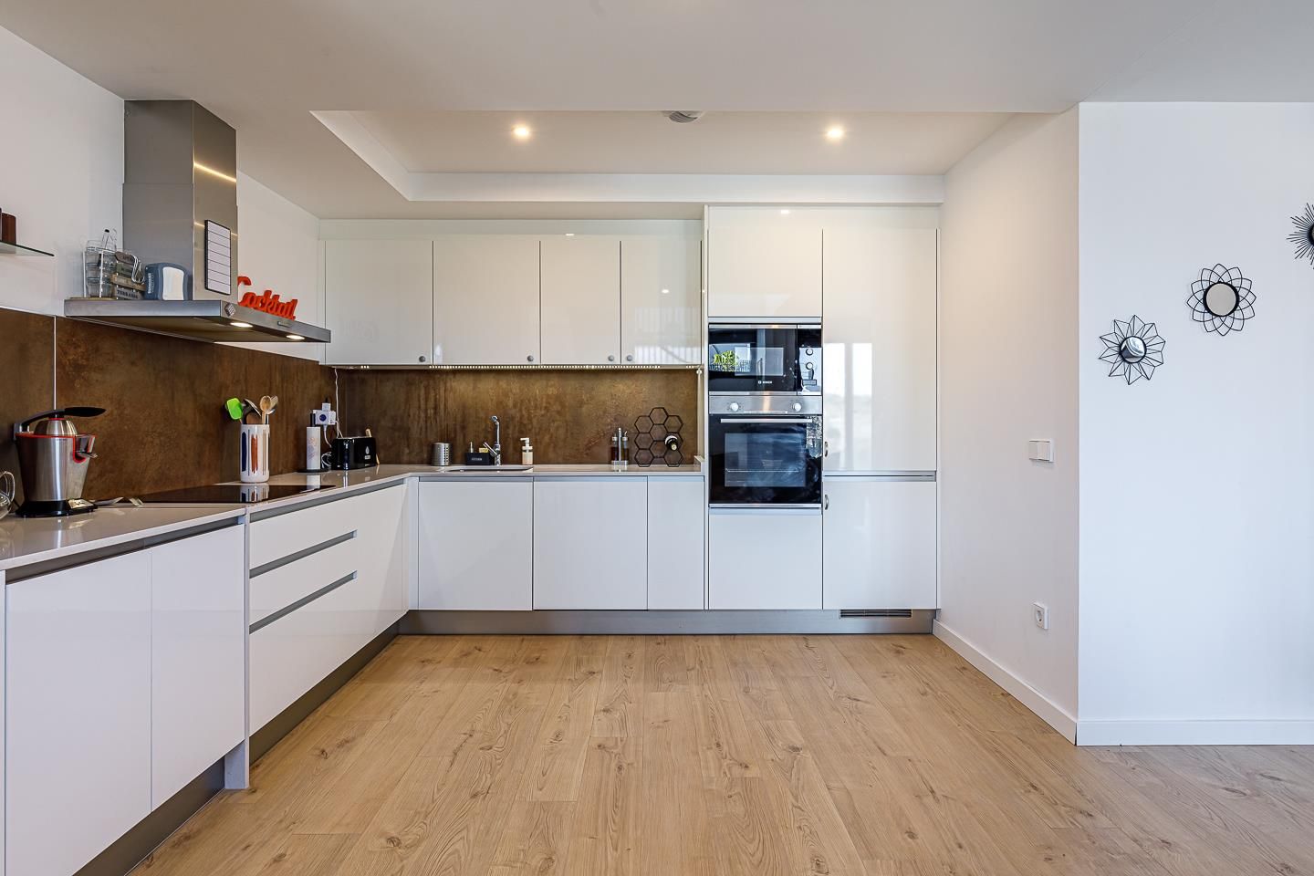 • open kitchen with electric hob, electric oven, microwave, dishwasher, refrigerator-freezer, coffee machine, electric kettle and toaster