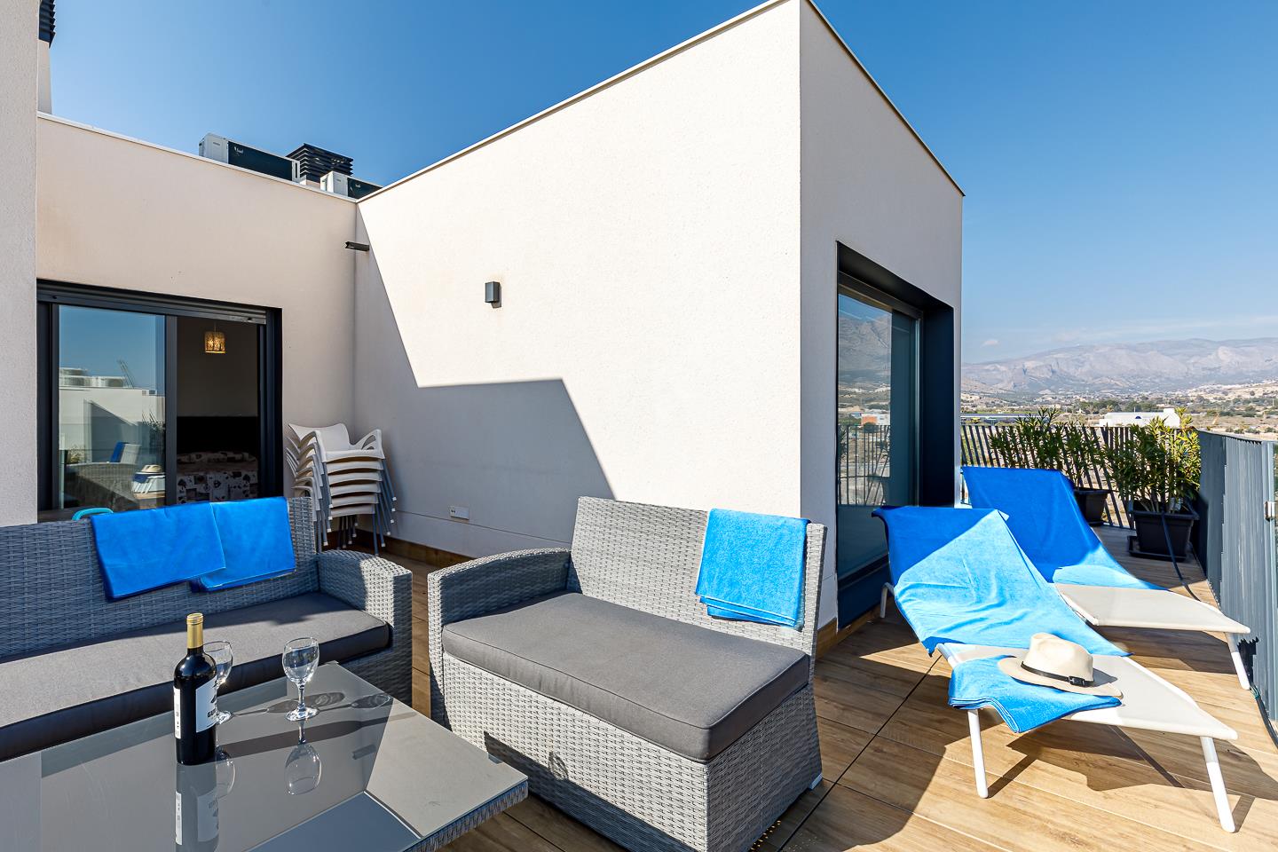 Modern and comfortable penthouse with communal pool in La Vila Joiosa, Costa Blanca, Spain for 6 persons. The house is situated in a residential beach area and is 100 m from the beach.