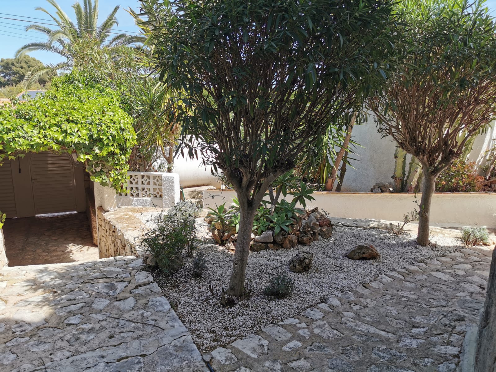 • jardin avec gravier, arbres, et mobilier de jardin avec chaises longues