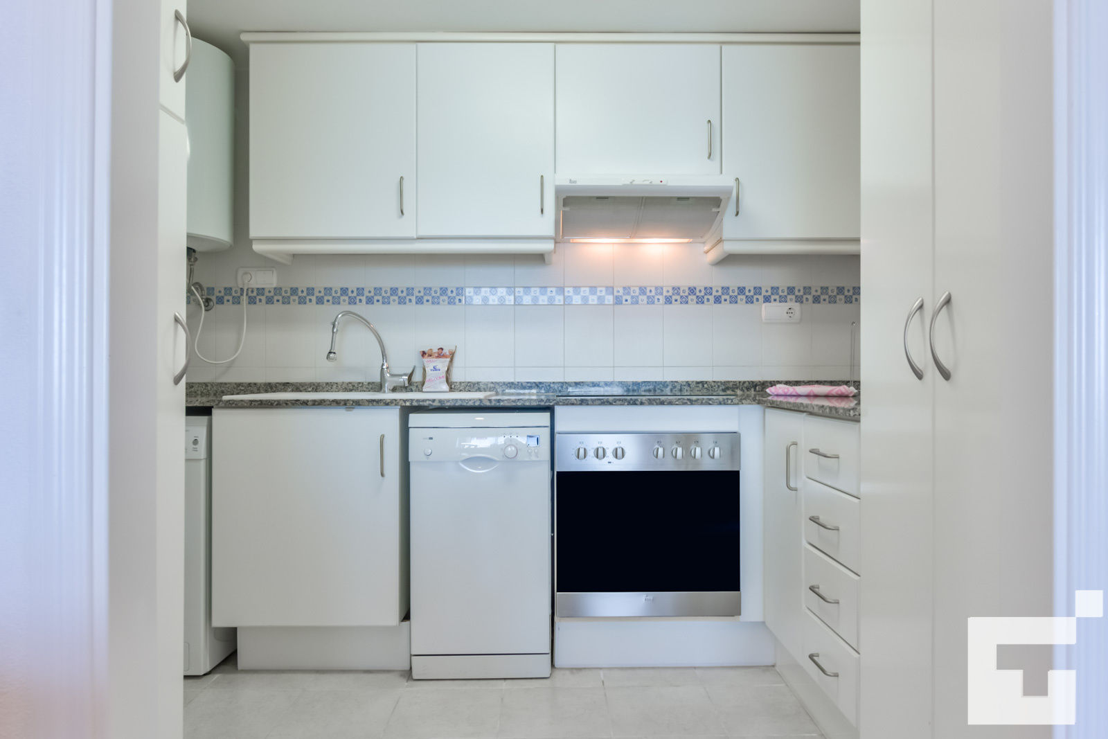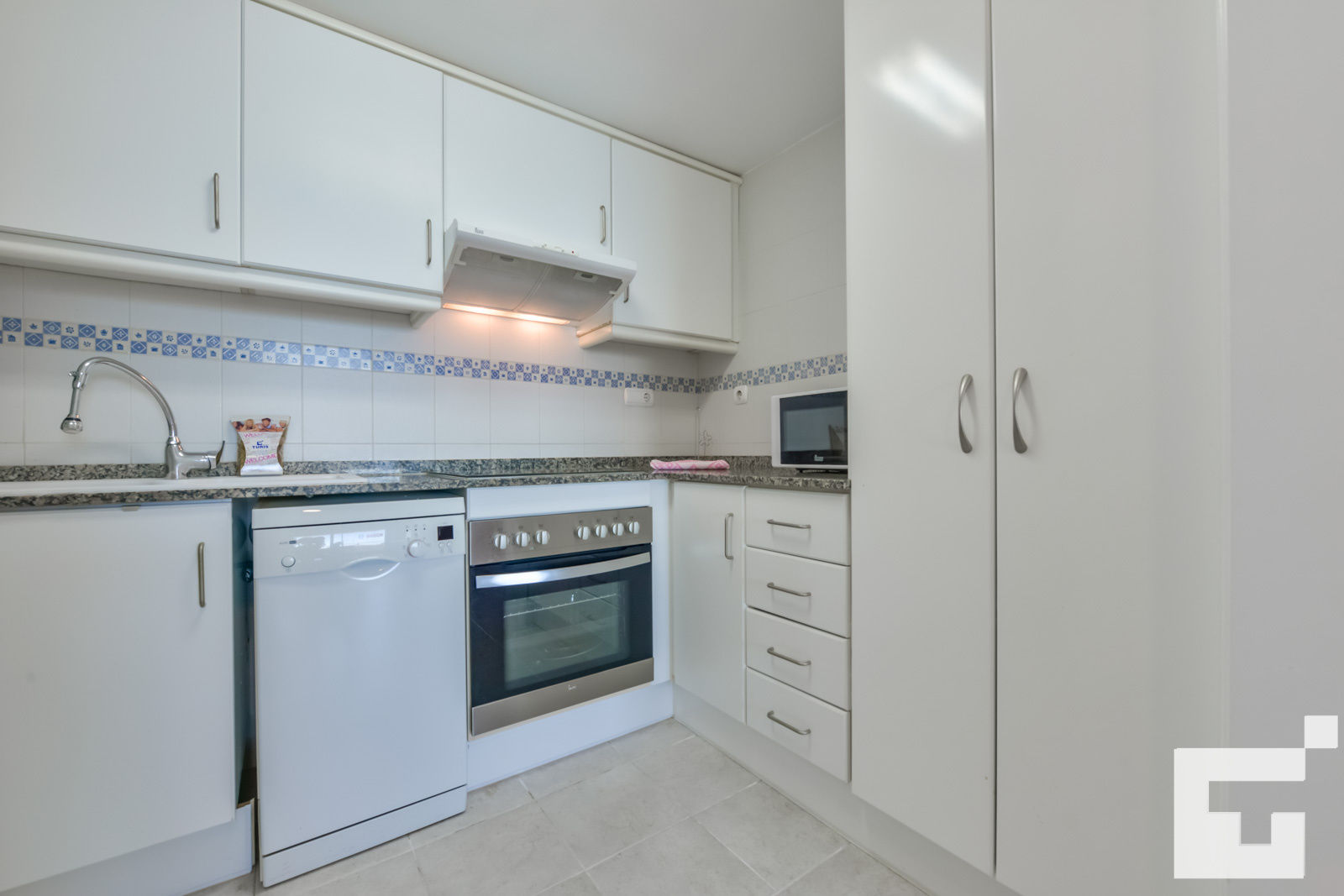 • cuisine ouverte avec plaque de cuisson électrique, four électrique, micro-ondes, lave-vaisselle, réfrigérateur, congélateur, machine à café, mixeur, grille-pain et presse-agrumes