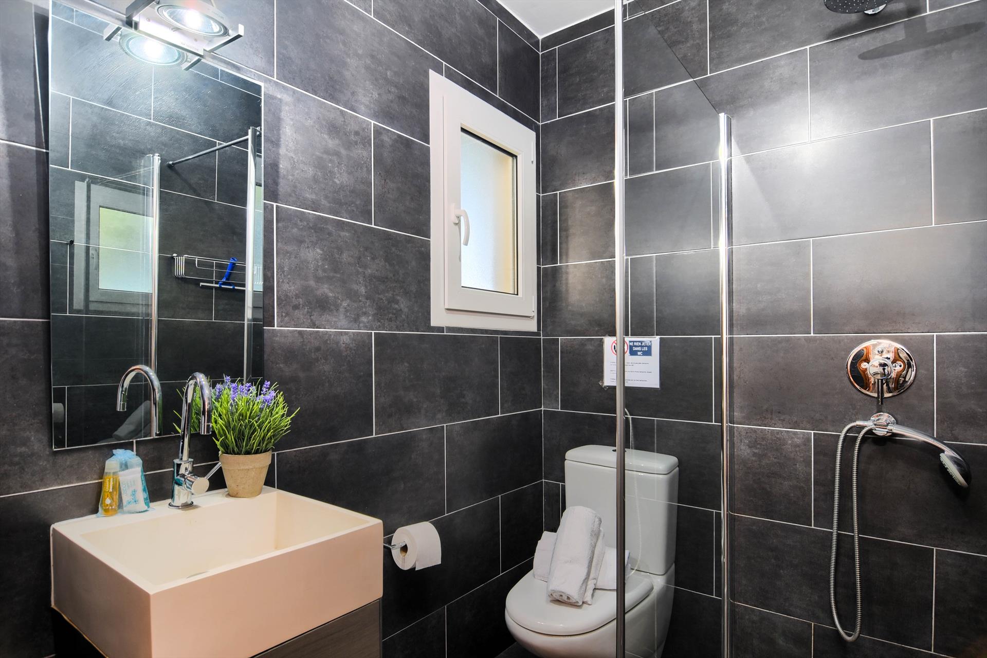 • salle de bains avec lavabo simple, douche et toilettes
