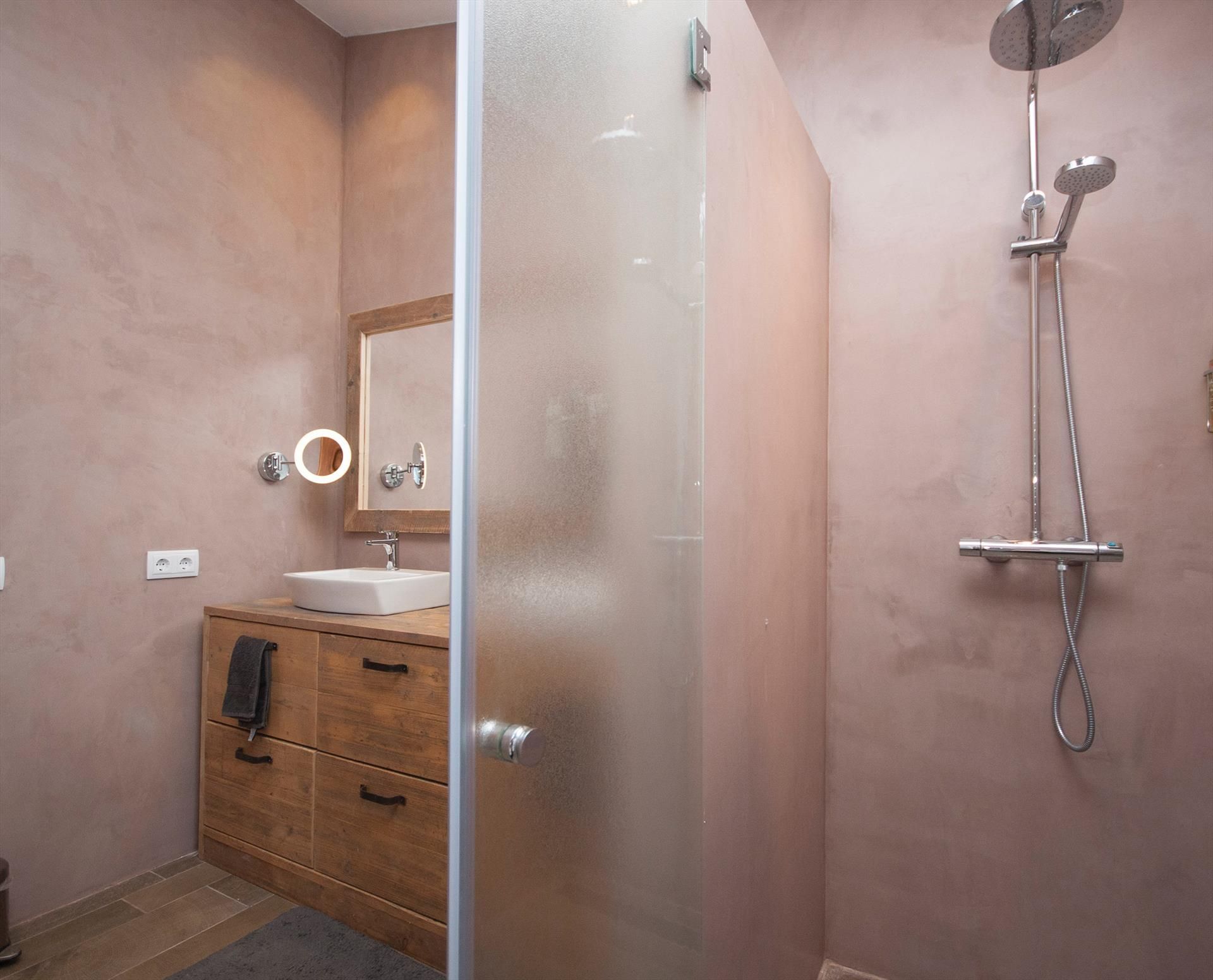 • badkamer met dubbele wastafel, douche, toilet en föhn