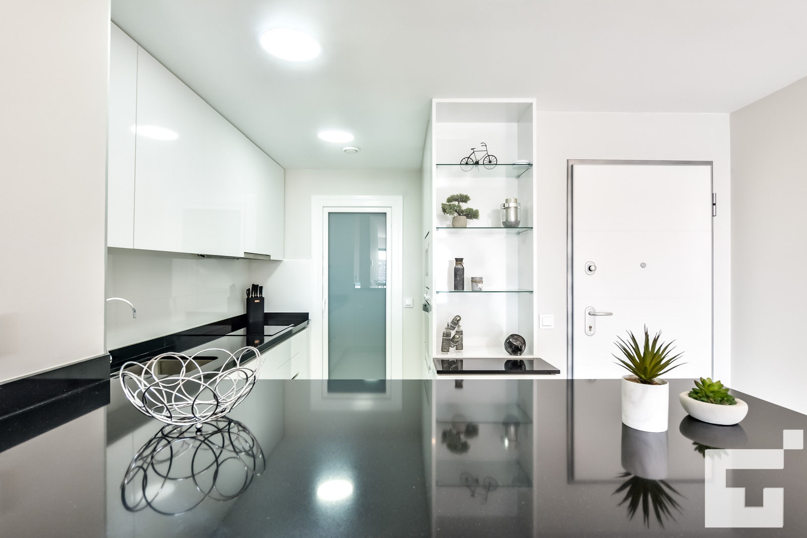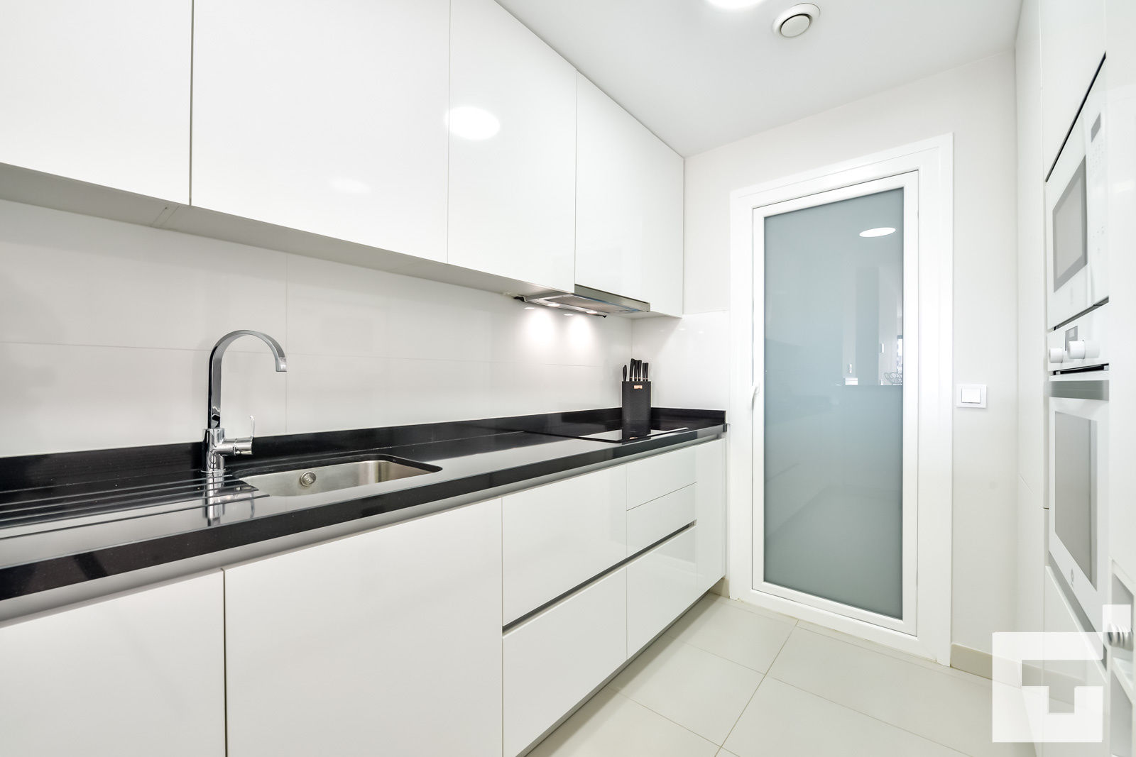 • open keuken met inductiekookplaat, elektrische oven, magnetron, vaatwasser, koelkast, diepvries, koffiezetapparaat, waterkoker, mixer, broodrooster, en sapcentrifuge